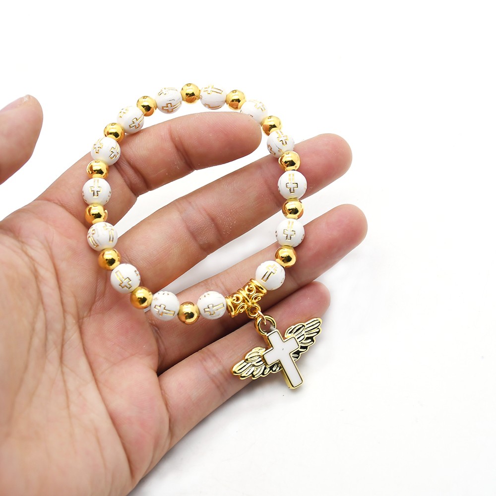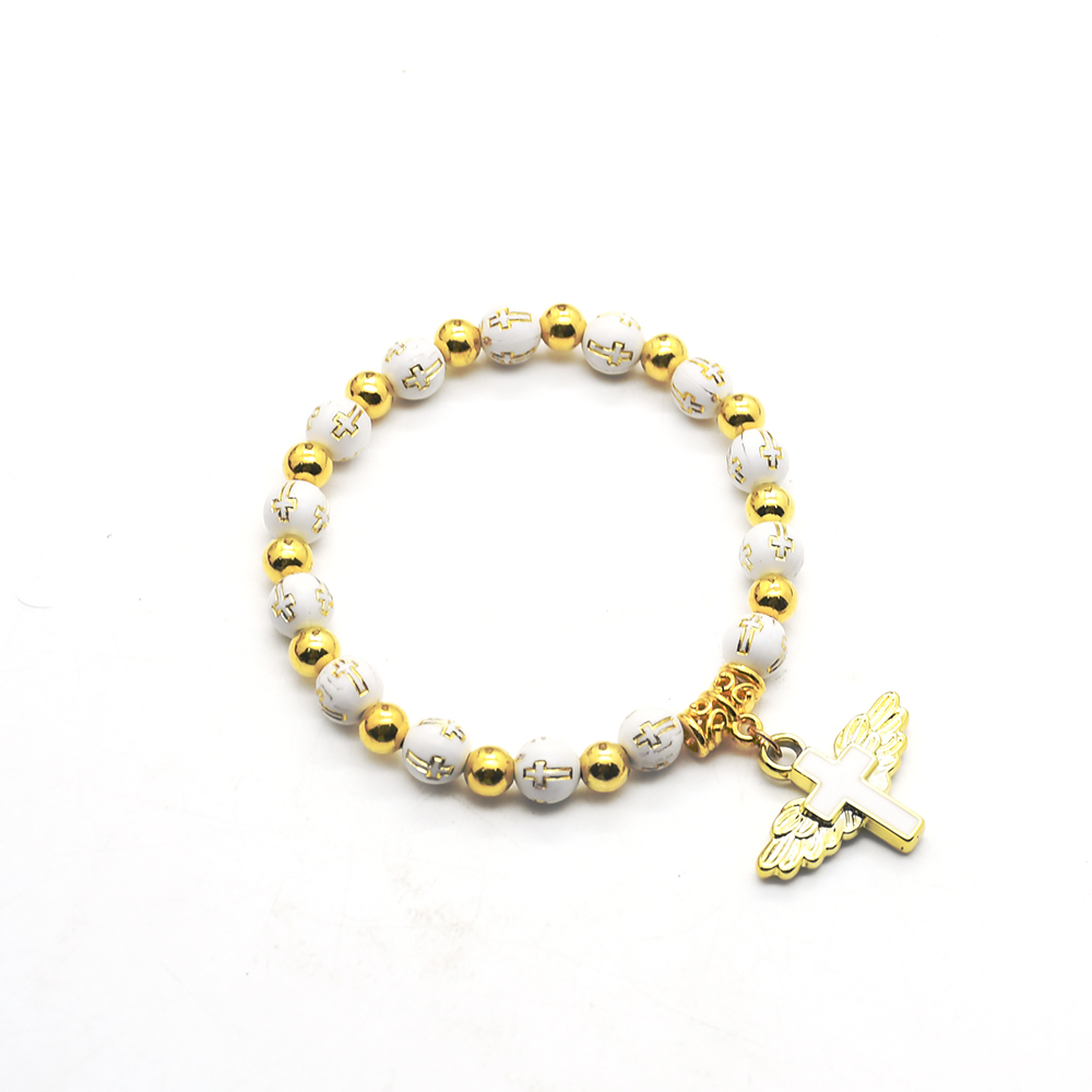 外貿跨鏡電商天使十字架手鏈手環(huán)金色十字珠十字手飾洗禮珠玫瑰