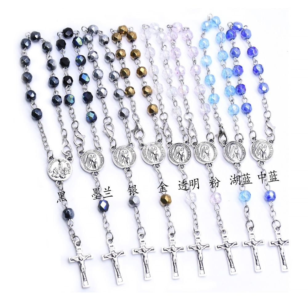 外貿(mào)跨境電商玫瑰十字架粉色念珠手鏈車掛