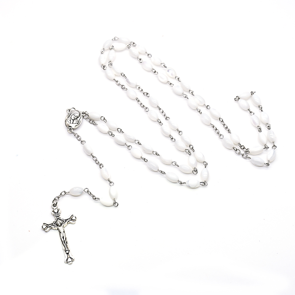 (白色)6mm玫瑰花珍珠十字架念珠項鏈59顆祈禱珠