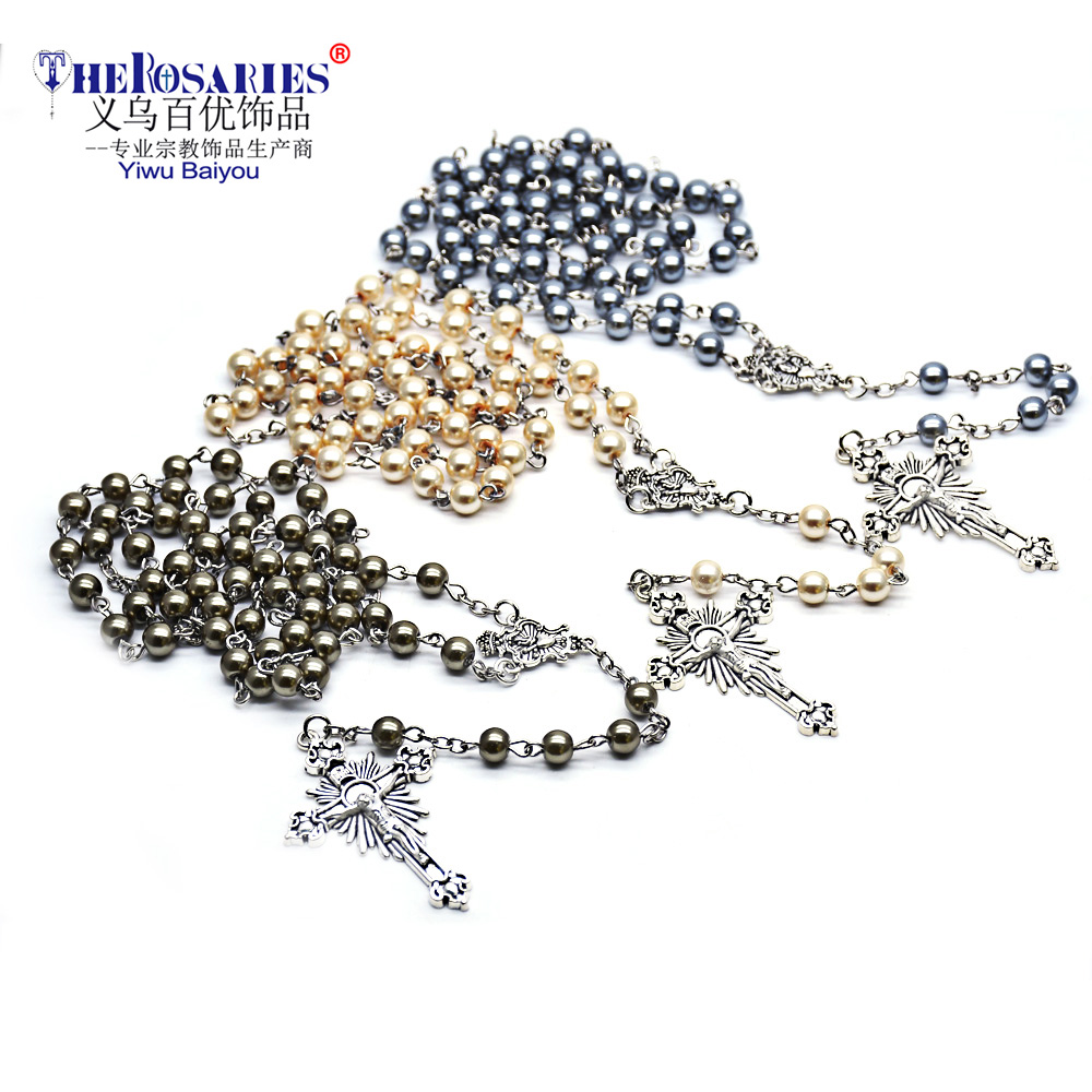 訂做款500條起 外貿特色產品6mm復古念珠項鏈三色珍珠十字架飾品