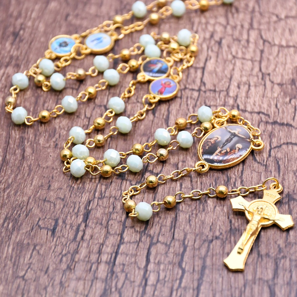 (灰)四圣像貼圖金屬珠水晶念珠十字架項鏈(圖片隨機)