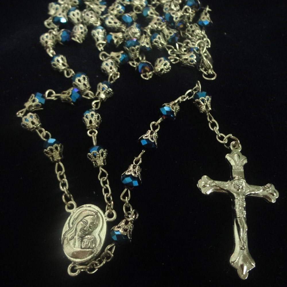 電商外貿(mào)產(chǎn)品8mm藍(lán)色水晶念珠十字架項(xiàng)鏈禮品批發(fā)