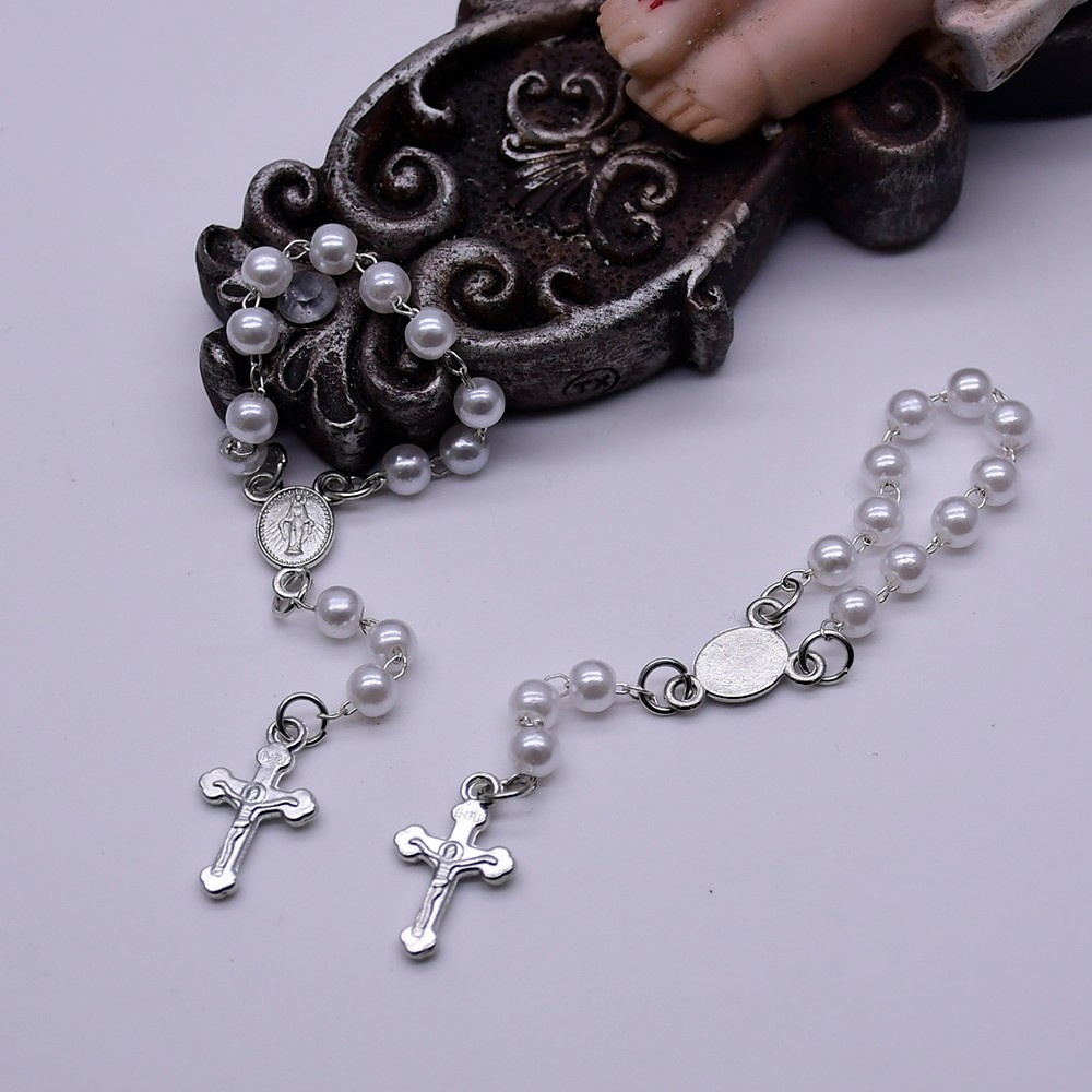 (銀色白K)車掛十字珠念珠洗禮珠十字架手鏈Rosary bracelet