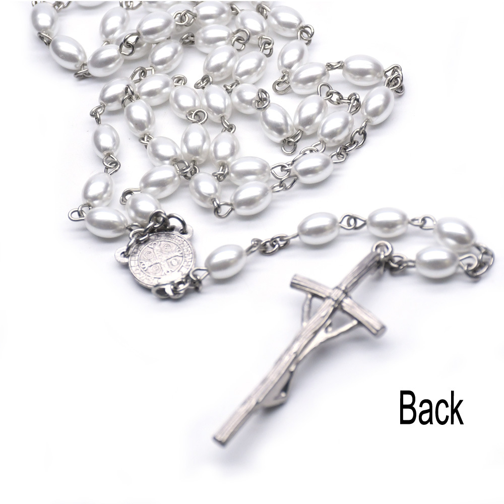 (白色)6mm玫瑰花珍珠十字架念珠項鏈59顆祈禱珠