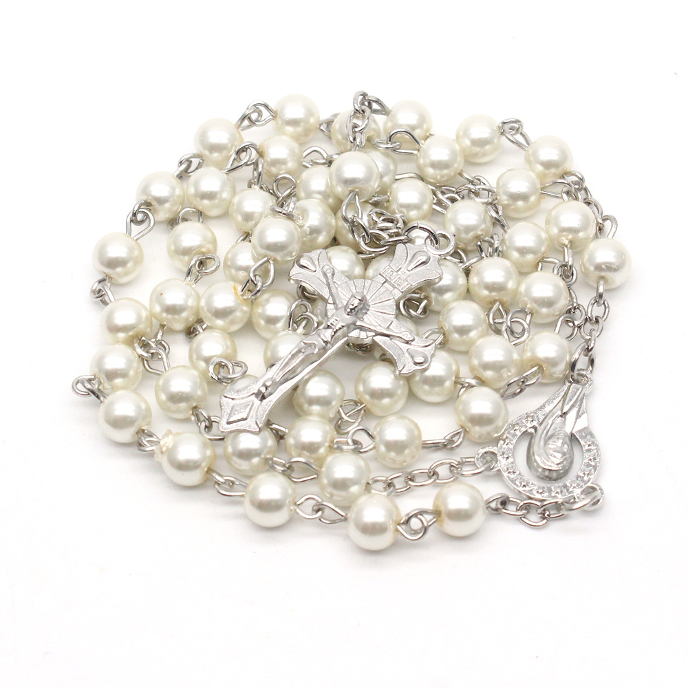 (珍珠色)6mm珍珠念珠十字架項鏈婚禮珠毛衣鏈珠鏈計數(shù)鏈