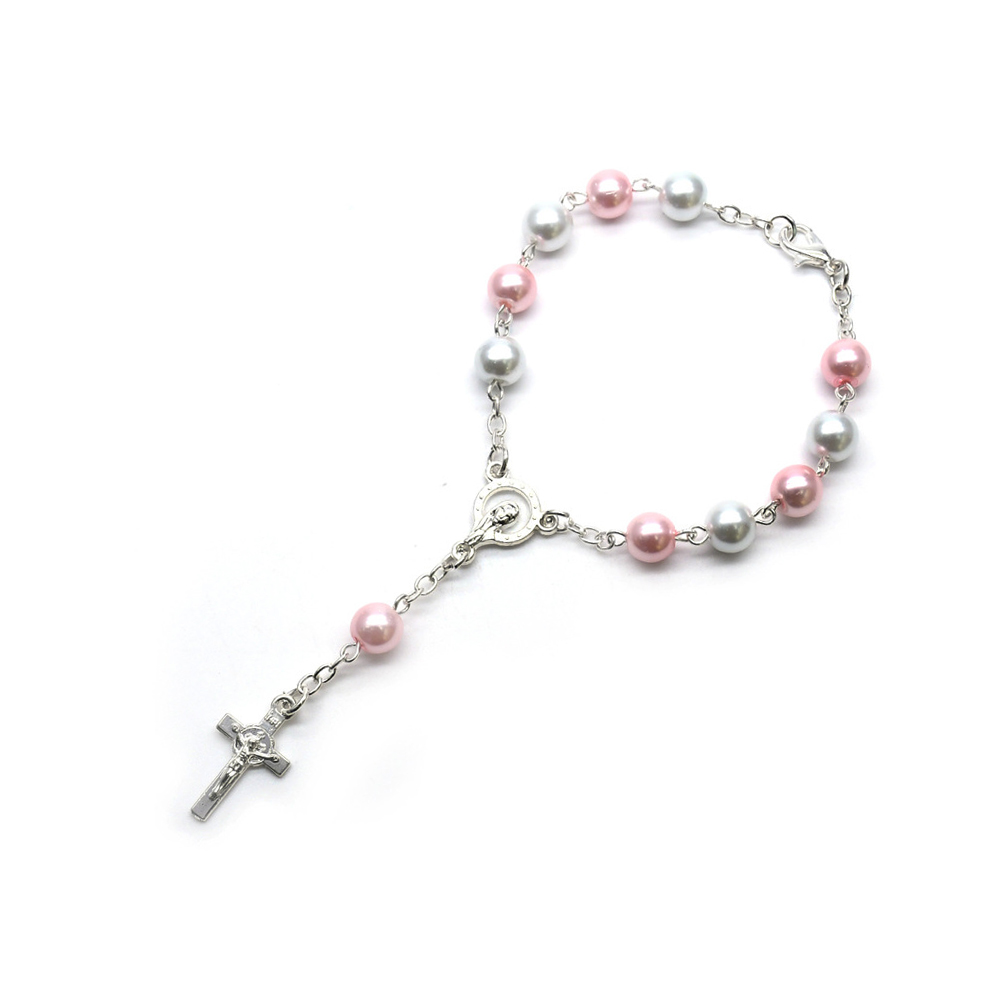 (銀色白K)車掛十字珠念珠洗禮珠十字架手鏈Rosary bracelet